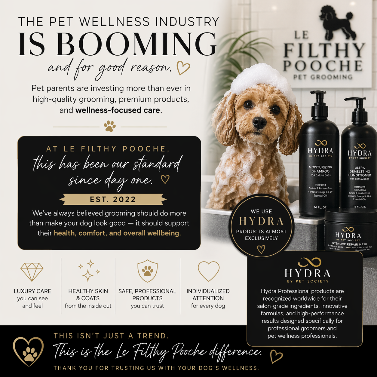 At Le Filthy Pooche, this has been our standard since day one. Since opening in 2022, we’ve believed grooming should be more than just a bath and haircut — it should support the health, comfort, and overall wellbeing of every dog that walks through our doors.